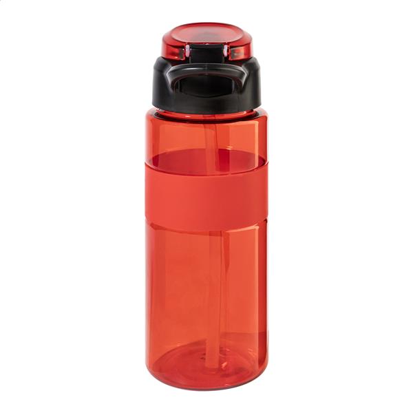 Butelka sportowa RPET z silikonowym uchwytem, ??automatycznie otwieraną klapką z wbudowaną słomką, silikonowym ustnikiem i blokadą bezpieczeństwa. Pojemność 700 ml. Bez BPA. Nie nadaje się do napojów gazowanych.