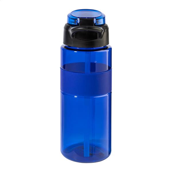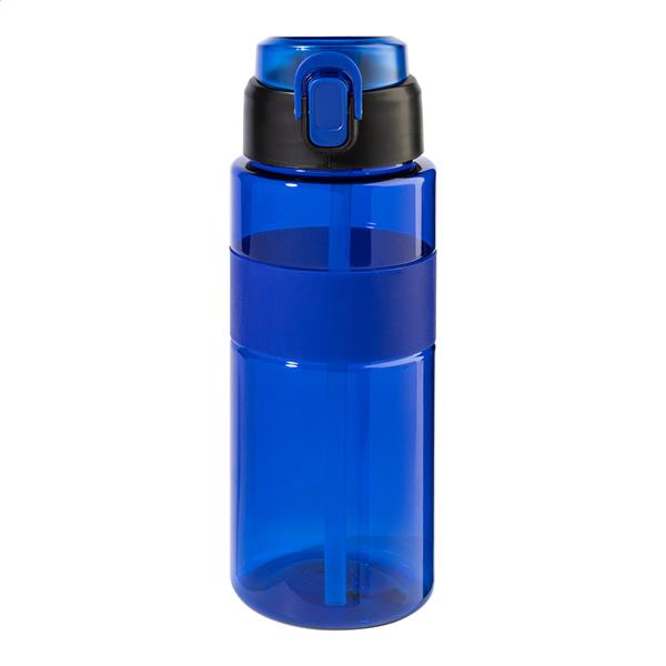 Butelka sportowa RPET z silikonowym uchwytem, ??automatycznie otwieraną klapką z wbudowaną słomką, silikonowym ustnikiem i blokadą bezpieczeństwa. Pojemność 700 ml. Bez BPA. Nie nadaje się do napojów gazowanych.