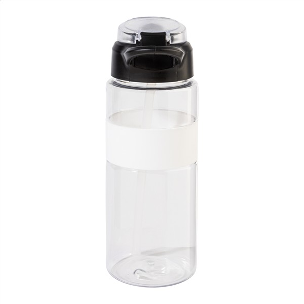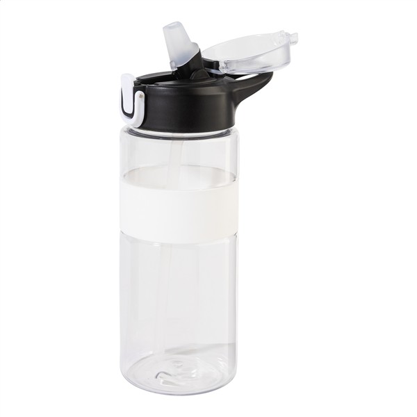Butelka sportowa RPET z silikonowym uchwytem, ??automatycznie otwieraną klapką z wbudowaną słomką, silikonowym ustnikiem i blokadą bezpieczeństwa. Pojemność 700 ml. Bez BPA. Nie nadaje się do napojów gazowanych.