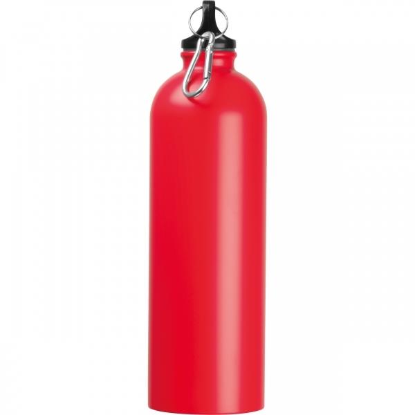Lekka, stalowa butelka o pojemności 750 ml, z zakrętką, do której przymocowany został karabińczyk, dzięki czemu butelkę można wygodnie przyczepić np. do plecaka.