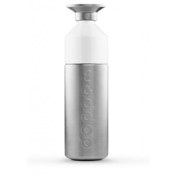 Producent nie zgadza się na umieszczanie logotypów firm z następujących branż:a. Partie polityczne (bez względu na ich poglądy)b. Przemysł zbrojeniowyc. Branża hazardowad. Przemysł tytoniowye. Branża erotycznaf. Firmy, które źle traktują zwierzętag. Marki oferujące swoje produkty w butelkach PET (np. Spa, Coca-Cola itp.)h. Firmy działające w branżach szkodliwych dla środowiska, takich jak ropa naftowa, gaz i górnictwo.Dbasz o środowisko? Lubisz ładny i praktyczny design? Jeśli tak, to stalowa butelka wielokrotnego użytku marki Dopper będzie idealnym wyborem. Unikatowy wzór autorstwa Rinke van Remrtela, najwyższej jakości materiały użyte do produkcji (bez BPA i ftalanów) oraz praktyczny kubek ukryty w zatyczce sprawiają, że jest to czego potrzebujesz! Butelka składa się tylko z trzech części – dzięki czemu można bardzo szybko umyć ją ręcznie lub po prostu wrzucić do zmywarki. Warto również dodać, że butelki Dopper stały się bardzo ważną częścią kultury holenderskiej. Zawdzięczają to nie tylko wyjątkowemu wzornictwu i jakości wykonania, ale przede wszystkim misji społecznej. Dzięki używaniu butelek wielokrotnego użytku możemy zmniejszyć ilość odpadów plastikowych. Dodatkowo 5% zysków firmy trafia bezpośrednio do fundacji, która wspiera między innymi projekty związane z dostarczaniem wody pitnej w Nepalu i oczyszczaniu oceanów. Dane techniczne: Pojemność: 800 ml Trzy części, bardzo łatwe do czyszczenia Można myć w zmywarce do 65 ° C / 149 ° F Do ciepłej i zimnej wody Ta butelka to nie termos! Materiały: Stal nierdzewna 18/8 (zakrętka i butelka) Tritan (kubek) TPE – elastomer termoplastyczny (uszczelka w czapce i kubku) Nie zawiera BPA / plastyfikator jest nietoksyczny