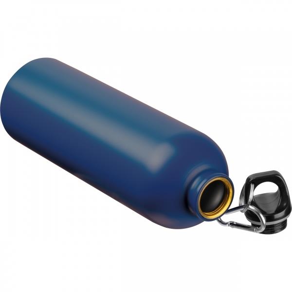 Lekka, stalowa butelka o pojemności 750 ml, z zakrętką, do której przymocowany został karabińczyk, dzięki czemu butelkę można wygodnie przyczepić np. do plecaka.