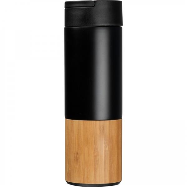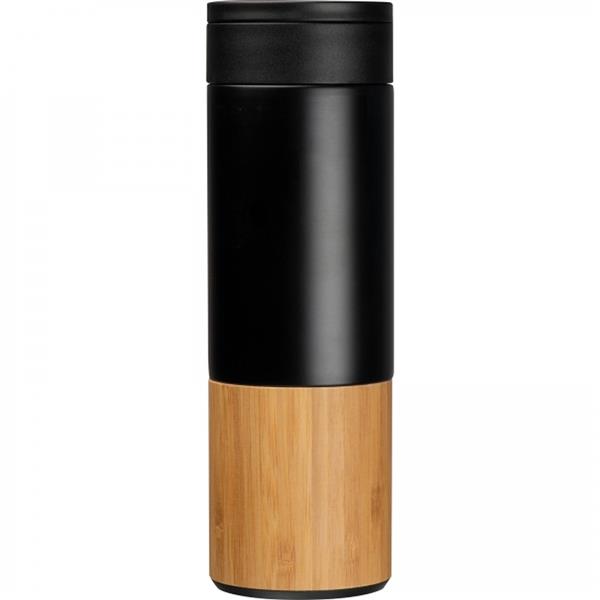Miedziana butelka izolowana próżniowo z dolną częścią wykonaną z bambusa, szczelnym wieczkiem, uchwytem do przenoszenia o pojemności 500 ml.