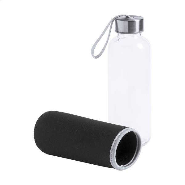 Szklana butelka z paskiem do noszenia na zakrętce i kolorowym neoprenowym pokrowcem. 420ml. Nie nadaje się do napojów gazowanych.