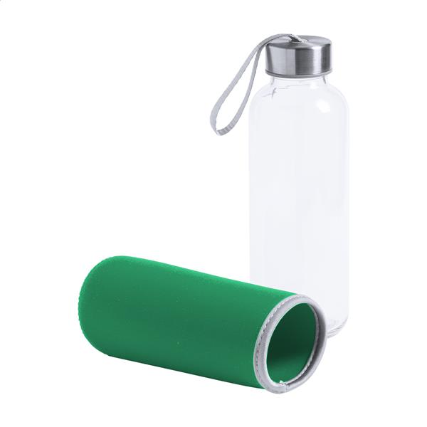 Szklana butelka z paskiem do noszenia na zakrętce i kolorowym neoprenowym pokrowcem. 420ml. Nie nadaje się do napojów gazowanych.