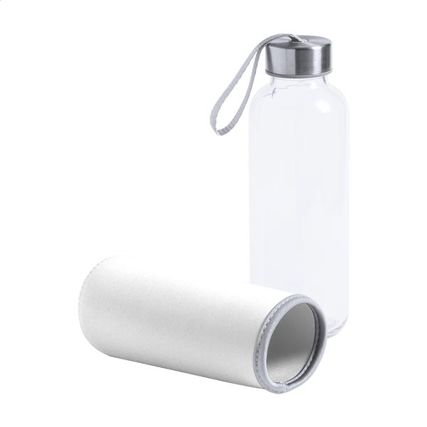 Szklana butelka z paskiem do noszenia na zakrętce i kolorowym neoprenowym pokrowcem. 420ml. Nie nadaje się do napojów gazowanych.
