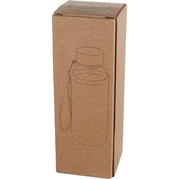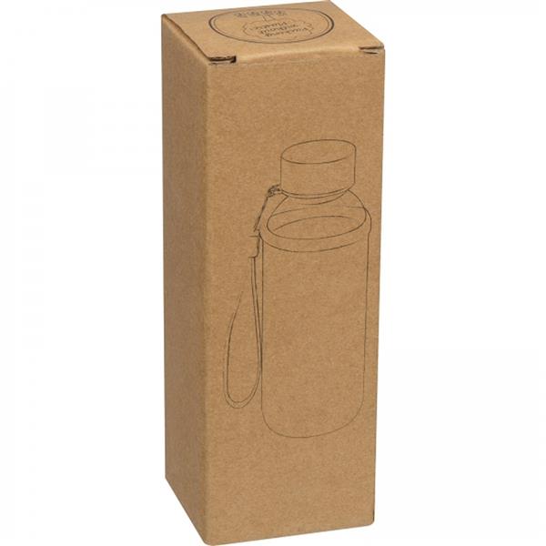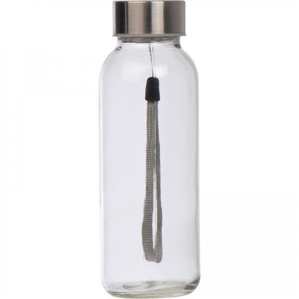 Szklana butelka z uchwytem do przenoszenia, zakrętką ze stali nierdzewnej, w neoprenowym pokrowcu. Pojemność 300 ml.