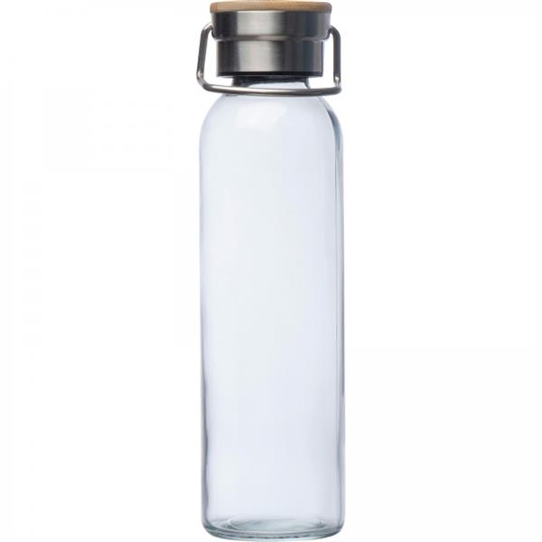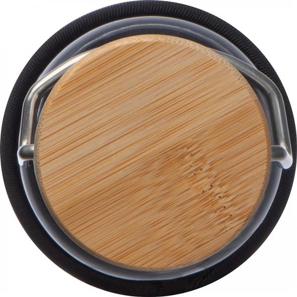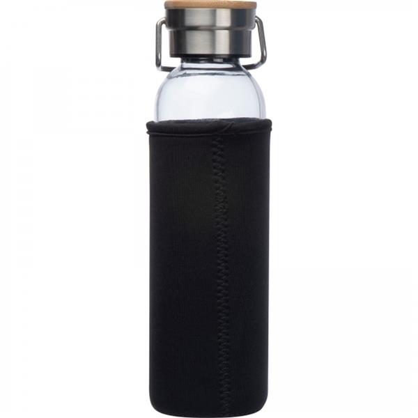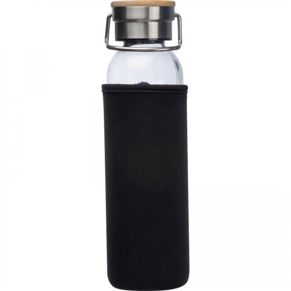 Szklana butelka o pojemności 600 ml, z pokrywką ze stali nierdzewnej i bambusowym zamknięciem. Butelkę przed uszkodzeniami chroni neopropanowe etui.