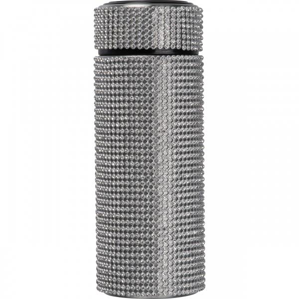 Butelka termiczna z podwójnymi ściankami, wykonana ze stali nierdzewnej ozdobionej cyrkoniami, pojemność 350 ml.