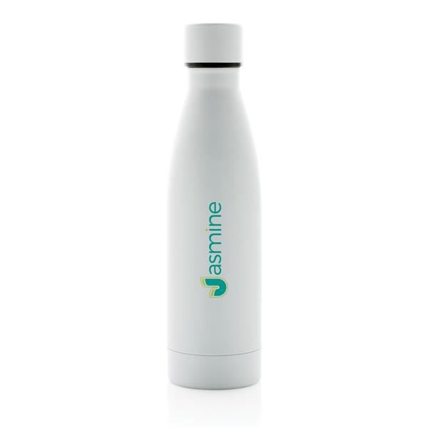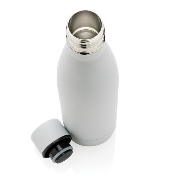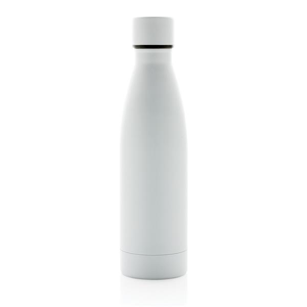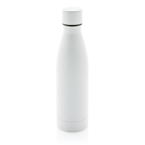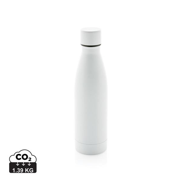 Butelka termiczna 500 ml, podwójne ścianki z próżnią pomiędzy, wykonana ze stali nierdzewnej z recyklingu z certyfikatem RCS (Recycled Claim Standard) który gwarantuje, że wykorzystane materiały pochodzą z recyklingu, całkowita zawartość materiału z recyklingu obliczona w oparciu o wagę całkowitą przedmiotu: 93%, pasuje do większości uchwytów samochodowych, w pudełku z papieru kraftowego, utrzymuje temperaturę napojów gorących do 20 godzin oraz zimnych do 15 godzin