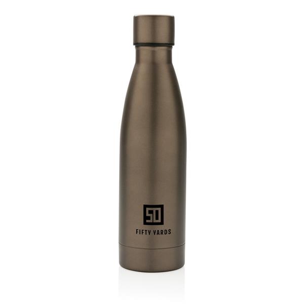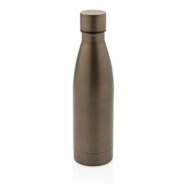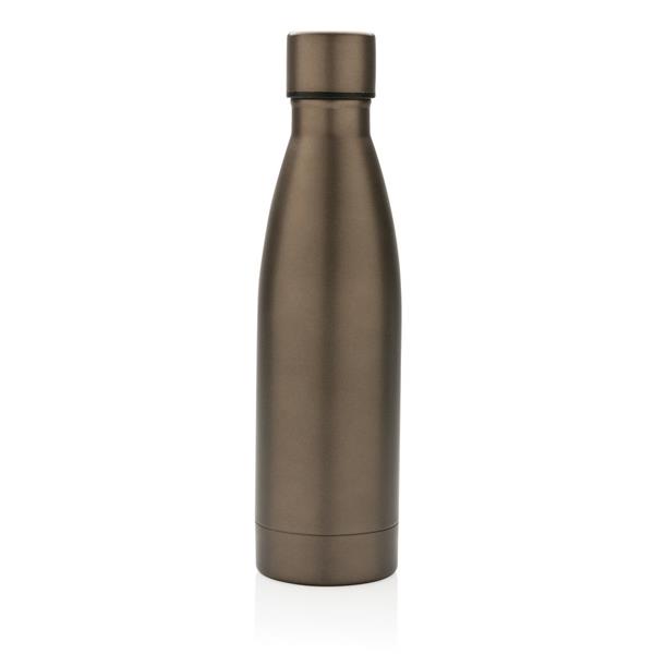 Butelka termiczna 500 ml, podwójne ścianki z próżnią pomiędzy, utrzymuje temperaturę napojów ciepłych do 5 godzin oraz zimnych do 15 godzin, wykonana ze stali nierdzewnej z recyklingu z certyfikatem RCS (Recycled Claim Standard) który gwarantuje, że wykorzystane materiały pochodzą z recyklingu, całkowita zawartość materiału z recyklingu obliczona w oparciu o wagę całkowitą przedmiotu: 93%, pasuje do większości uchwytów samochodowych, w pudełku z papieru kraftowego z certyfikatem FSC® (Forest Stewardship Council), klasa termiczna: A