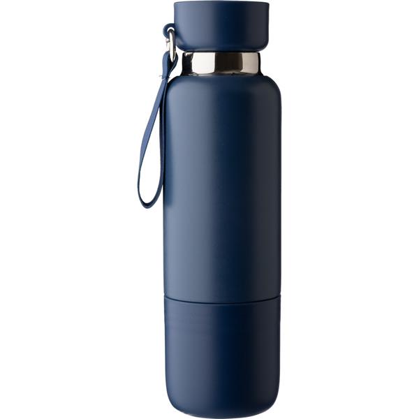 Butelka termiczna 500 ml, posiada podwójne ścianki ze stali nierdzewnej z próżnią między ściankami, co spowalnia oddawanie temperatury na zewnątrz, zachowując funkcje termosu, zakrętka funkcjonująca jako kubek umożliwia wygodne i higieniczne dzielenie się napojem, uchwyt ułatwiający noszenie, matowe wykończenie, produkt wykonany ze stali nierdzewnej, zakrętka z PP, uchwyt z poliestru, utrzymuje temperaturę napojów gorących do 20 godzin +leakproof