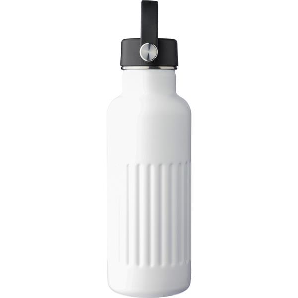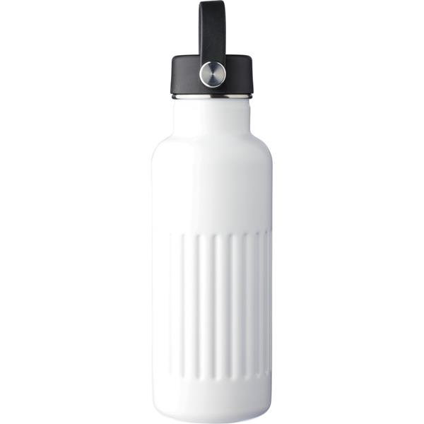 Butelka 500 ml ze stali nierdzewnej, posiada podwójne ścianki, które spowalniają oddawanie temperatury na zewnątrz, zewnętrzna część wykonana jest ze stali nierdzewnej 201, a wewnętrzna ścianka ze stali nierdzewnej 304, pokrywka, żebrowany design, uchwyt ułatwiający noszenie, ikona recyklingu na produkcie, zapakowana w brązowe kartonowe pudełko, utrzymuje temperaturę napojów gorących do 20 godzin