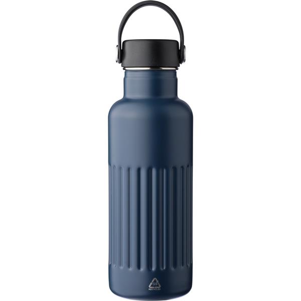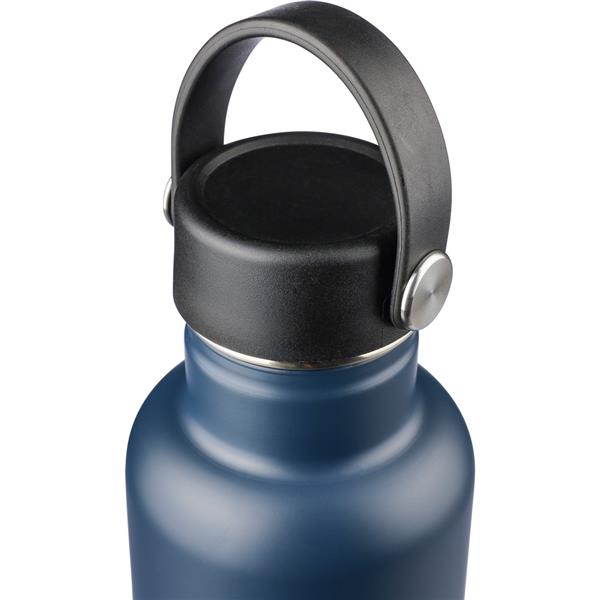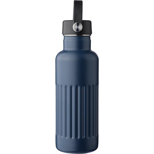 Butelka 500 ml ze stali nierdzewnej, posiada podwójne ścianki, które spowalniają oddawanie temperatury na zewnątrz, zewnętrzna część wykonana jest ze stali nierdzewnej 201, a wewnętrzna ścianka ze stali nierdzewnej 304, pokrywka, żebrowany design, uchwyt ułatwiający noszenie, ikona recyklingu na produkcie, zapakowana w brązowe kartonowe pudełko, utrzymuje temperaturę napojów gorących do 20 godzin