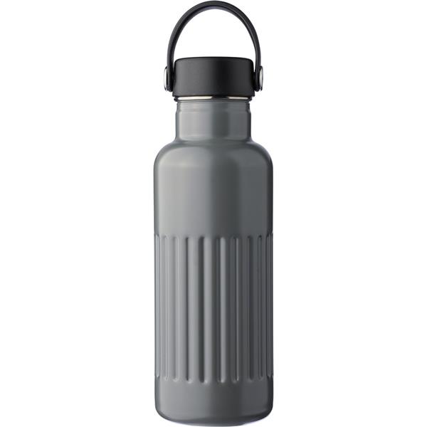 Butelka 500 ml ze stali nierdzewnej, posiada podwójne ścianki, które spowalniają oddawanie temperatury na zewnątrz, zewnętrzna część wykonana jest ze stali nierdzewnej 201, a wewnętrzna ścianka ze stali nierdzewnej 304, pokrywka, żebrowany design, uchwyt ułatwiający noszenie, ikona recyklingu na produkcie, zapakowana w brązowe kartonowe pudełko, utrzymuje temperaturę napojów gorących do 20 godzin