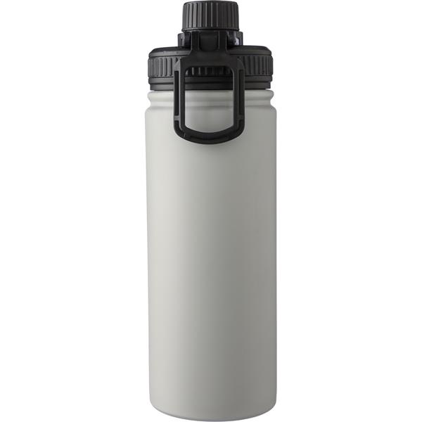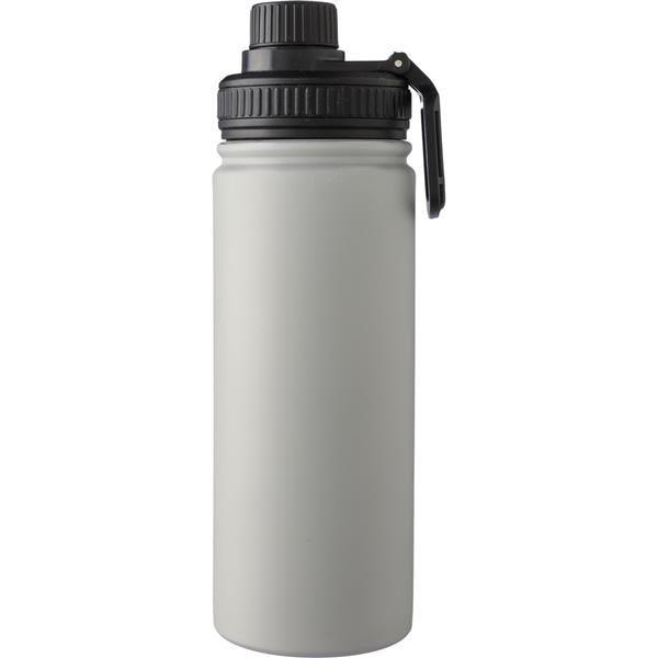 Butelka termiczna 500 ml, posiada podwójne ścianki ze stali nierdzewnej z próżnią między ściankami dzięki czemu zachowuje funkcje termosu i długo utrzymuje temperaturę nie oddając jej na zewnątrz, zakręcana wylewka we wieczku, uchwyt ułatwiający przenoszenie lub przypięcie do innego przedmiotu, zapakowana w brązowy kartonik, produkt wykonany ze stali nierdzewnej i PU