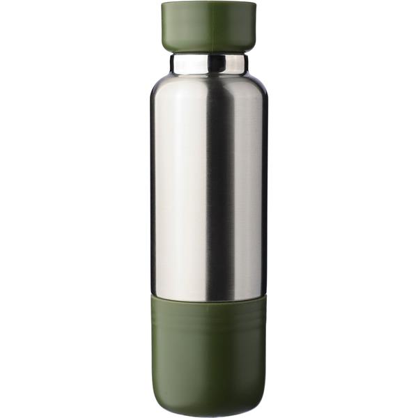 Butelka termiczna 500 ml ze stali nierdzewnej podwójne ścianki ze stali nierdzewnej z próżnią między ściankami dzięki czemu zachowuje funkcje termosu i długo utrzymuje temperaturę nie oddając jej na zewnątrz, zewnętrzna część wykonana jest ze stali nierdzewnej 201, a wewnętrzna ścianka ze stali nierdzewnej 304, nakrętką z PP, pasek ułatwiający noszenie, kubek 200 ml umieszczany w podstawie, pakowana w papierowy kartonik