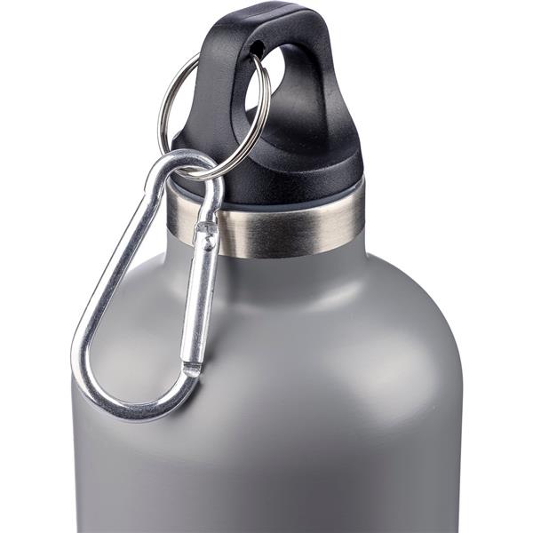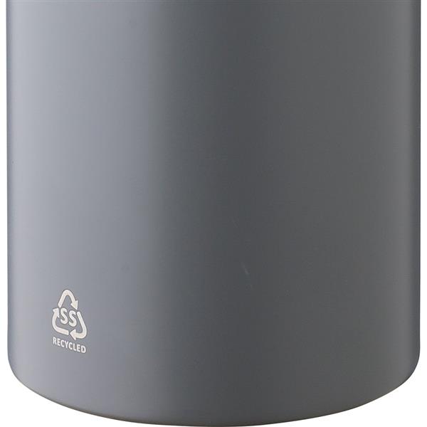 Butelka termiczna 500 ml, posiada podwójne ścianki, które spowalniają oddawanie temperatury na zewnątrz, utrzymuje temperaturę napojów: ciepłych do 8 godzin, zimnych do 12 godzin, posiada matowe wykończenie (z wyjątkiem koloru -32), ikona recyklingu na produkcie, nie nadaje się do mycia w zmywarce, pakowana pojedynczo w brązowe kartonowe pudełko, produkt wykonany stali nierdzewnej z recyklingu, nakrętka z PP, aluminiowy karabińczyk
