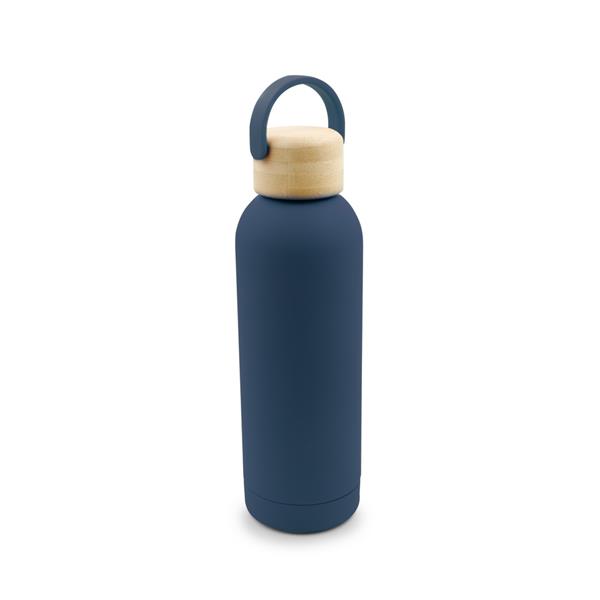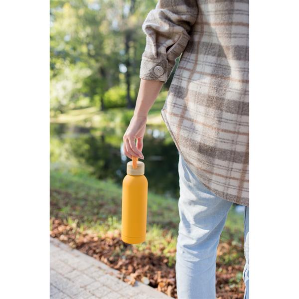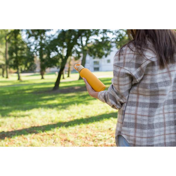 Butelka termiczna 500 ml, posiada podwójne ścianki ze stali nierdzewnej z próżnią między ściankami, co spowalnia oddawanie temperatury na zewnątrz, zachowując funkcje termosu, gumowe wykończenie, bambusowa zakrętka ze składanym uchwytem wykonanym z silikonu ułatwiającym noszenie, produkt wykonany ze stali nierdzewnej, plastiku i bambusa, utrzymuje temperaturę napojów gorących do 20 godzin +leakproof
