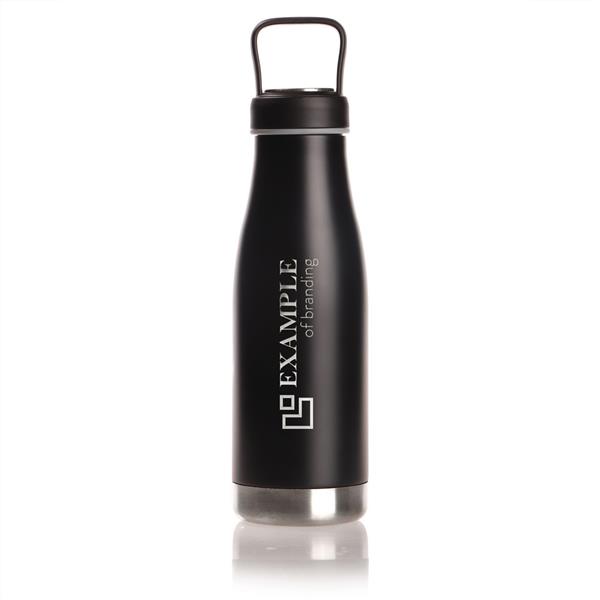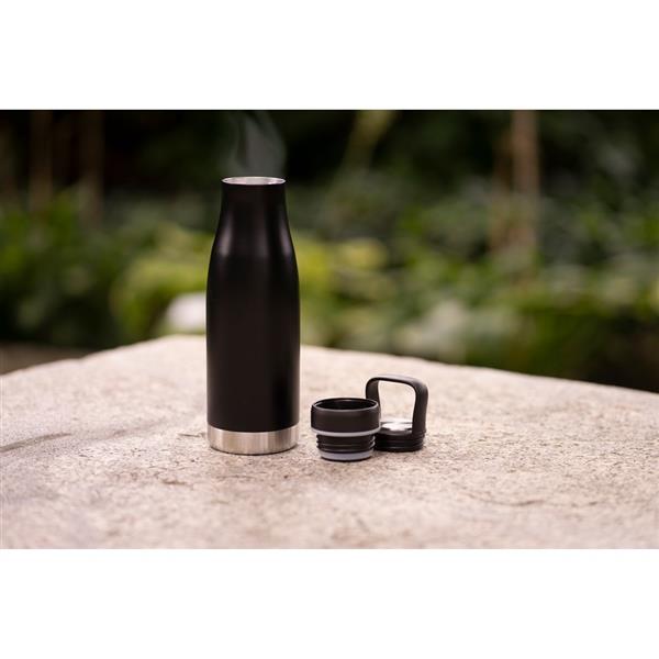 Butelka termiczna 500 ml Mauro Conti z uchwytem i metalowym ringiem, podwójne ścianki ze stali nierdzewnej z próżnią między ściankami dzięki czemu zachowuje funkcje termosu i długo utrzymuje temperaturę nie oddając jej na zewnątrz, pojemnik w zakrętce, w ozdobnym pudełku, utrzymuje temperaturę napojów gorących do 10 godzin +leakproof