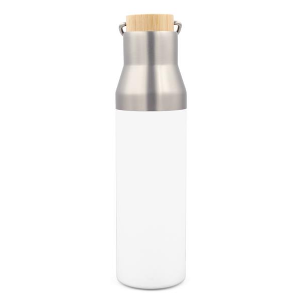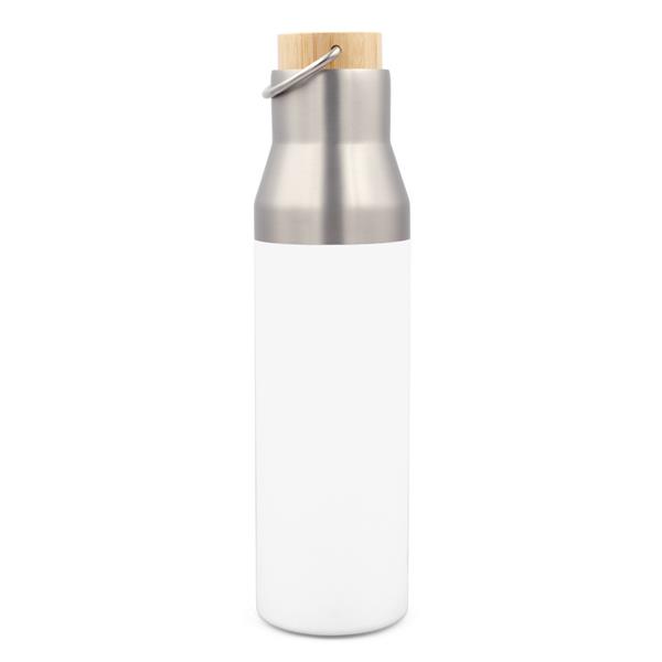 Butelka termiczna 550 ml, posiada podwójne ścianki ze stali nierdzewnej z próżnią między ściankami, co spowalnia oddawanie temperatury na zewnątrz, zachowując funkcje termosu, zakrętka z bambusowym elementem i metalowym uchwytem ułatwiającym noszenie lub przypięcie, produkt wykonany m.in. ze stali nierdzewnej recyklingu, utrzymuje temperaturę napojów gorących do 20 godzin +leakproof