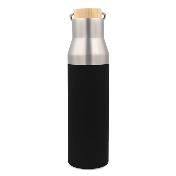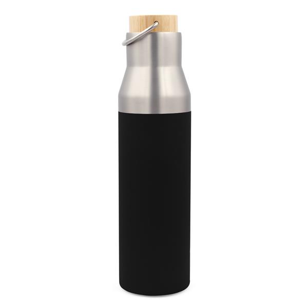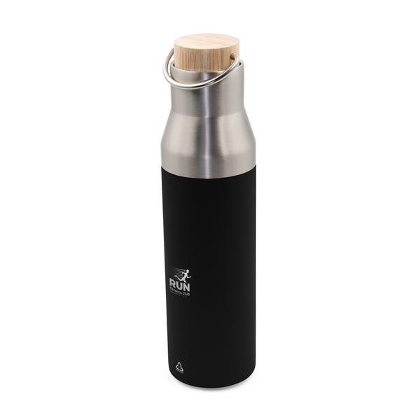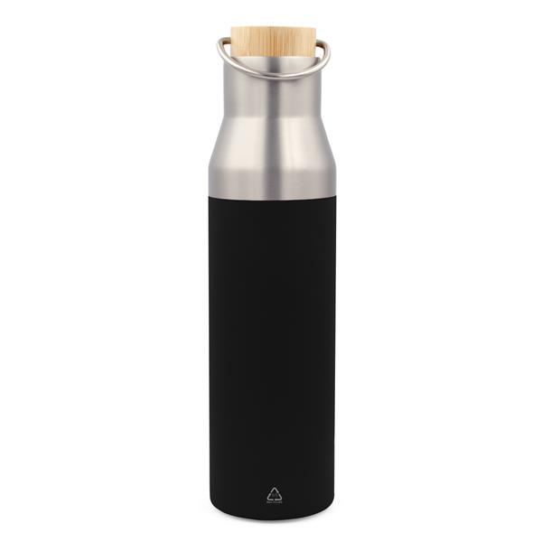 Butelka termiczna 550 ml, posiada podwójne ścianki ze stali nierdzewnej z próżnią między ściankami, co spowalnia oddawanie temperatury na zewnątrz, zachowując funkcje termosu, zakrętka z bambusowym elementem i metalowym uchwytem ułatwiającym noszenie lub przypięcie, produkt wykonany m.in. ze stali nierdzewnej recyklingu, utrzymuje temperaturę napojów gorących do 20 godzin +leakproof