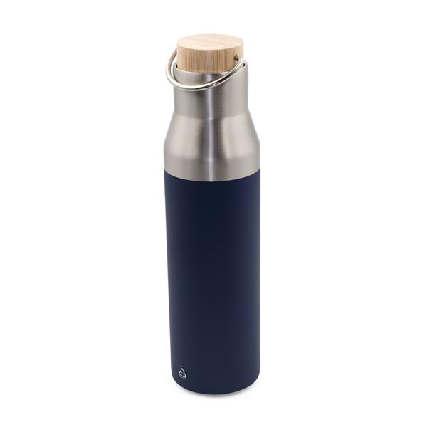 Butelka termiczna 550 ml, posiada podwójne ścianki ze stali nierdzewnej z próżnią między ściankami, co spowalnia oddawanie temperatury na zewnątrz, zachowując funkcje termosu, zakrętka z bambusowym elementem i metalowym uchwytem ułatwiającym noszenie lub przypięcie, produkt wykonany m.in. ze stali nierdzewnej recyklingu, klasa termiczna: A +leakproof