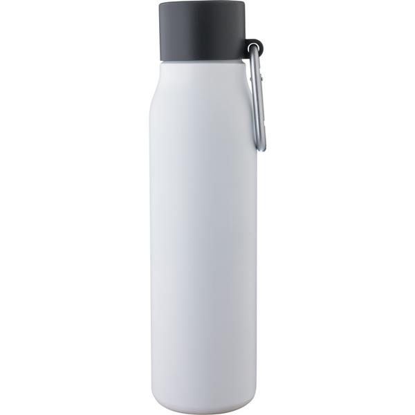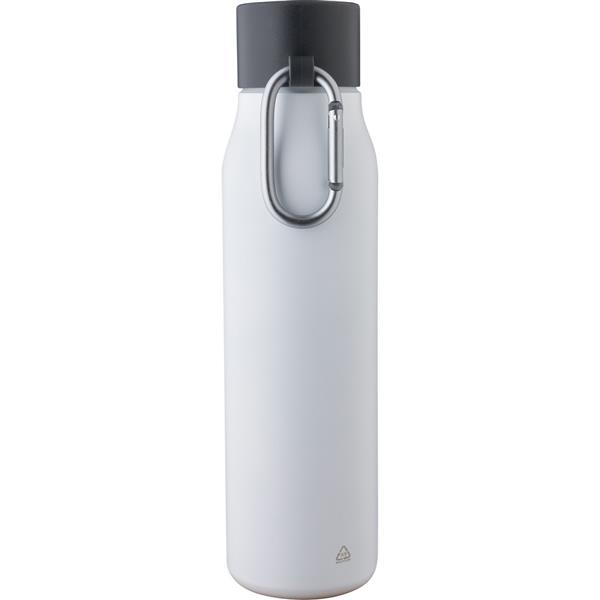 Butelka termiczna 600 ml, uchwyt ułatwiający przenoszenie, utrzymuje temperaturę napojów – ciepłych do 6 godzin, zimnych do 9 godzin, na przedniej części ikona aluminium z recyklingu na produkcie, pakowana pojedynczo w brązowe kartonowe pudełko, wnętrze wykonane ze stali nierdzewnej 304, zewnętrzna warstwa ze stali nierdzewnej 201,szczelna czarna nakrętka z PP, aluminiowy karabińczyk