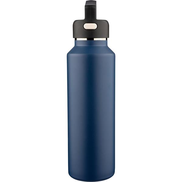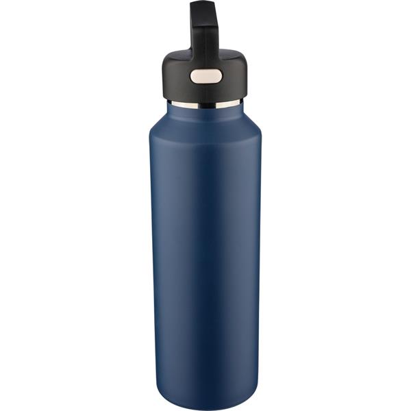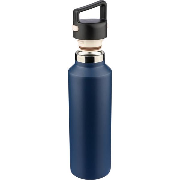 Butelka termiczna 600 ml, posiada podwójne ścianki ze stali nierdzewnej z próżnią między ściankami, co spowalnia oddawanie temperatury na zewnątrz, zachowując funkcje termosu, uchwyt ułatwiający przenoszenie, zawiera przyciski po bokach do otwierania pokrywki, pakowany pojedynczo w brązowe kartonowe pudełko, produkt wykonany z recyklingowej stali nierdzewnej (wewnątrz 304 / na zewnątrz 201) z pokrywką z PP, utrzymuje temperaturę napojów gorących do 4 godzin