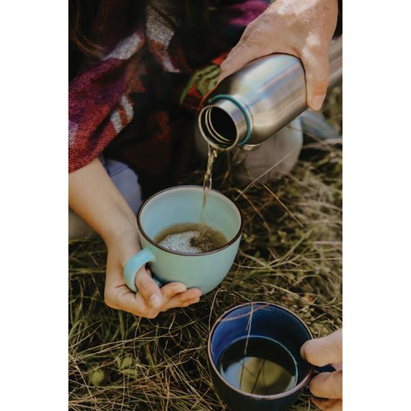 Butelka termiczna 750 ml z uchwytem, szczelna, podwójne ścianki ze stali nierdzewnej z próżnią pomiędzy, nadaje się do zimnych i gorących napojów, klasa termiczna: C