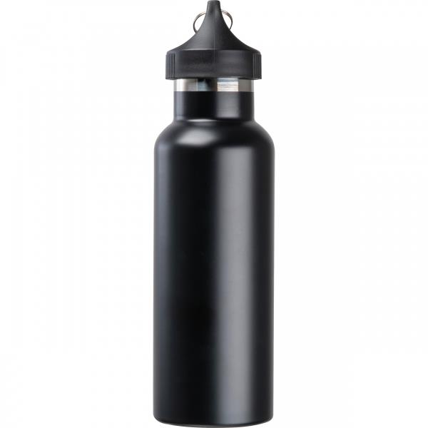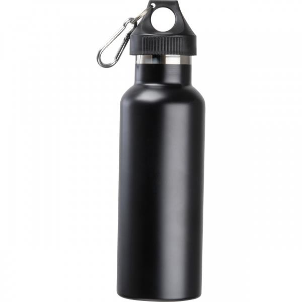 Butelka termiczna ze stali nierdzewnej, z matową powłoką. W zakrętce znajduje się karabińczyk, dzięki któremu butelkę można przymocować np. do plecaka.