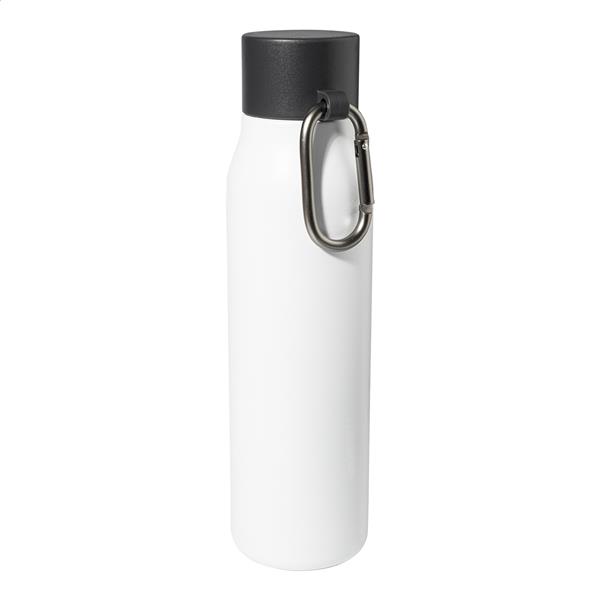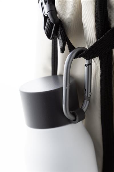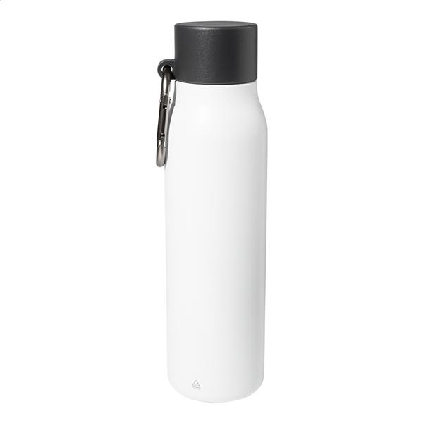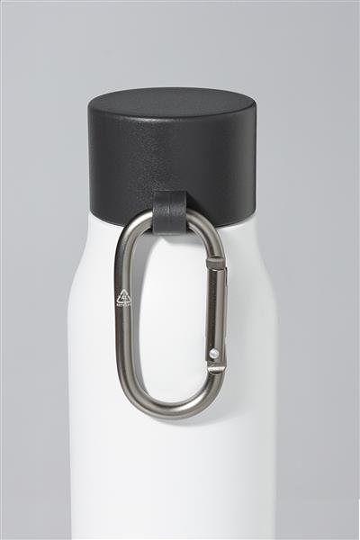 Dwuścienna, izolowana butelka próżniowa ze stali nierdzewnej z pokrywką z PP i karabińczykiem z recyklingowanego aluminium. Pojemność 500 ml.