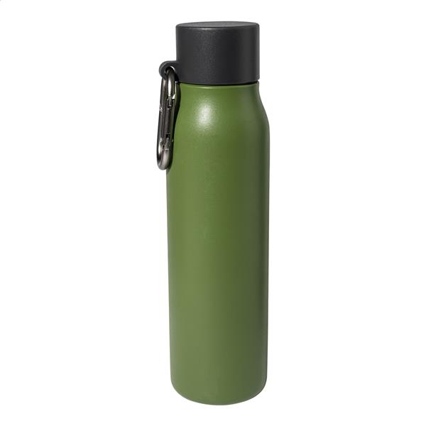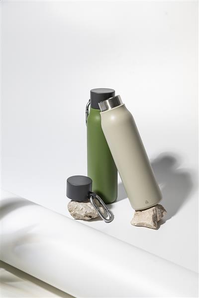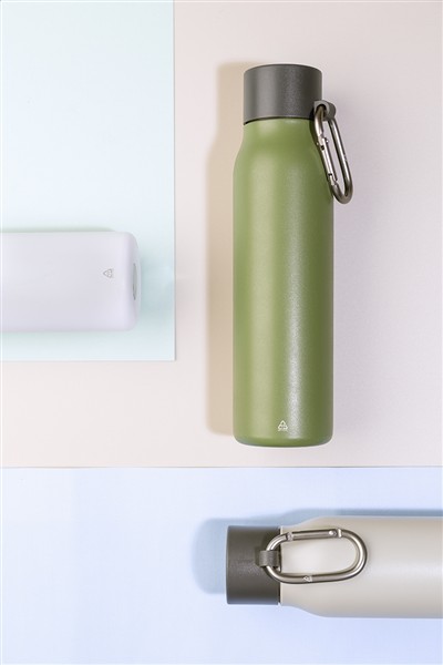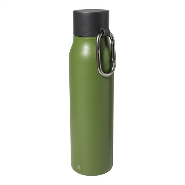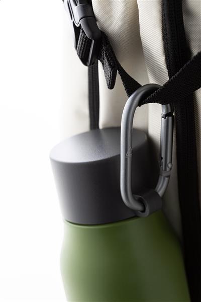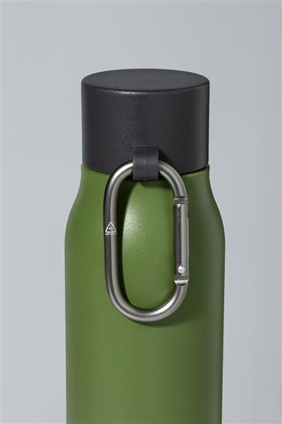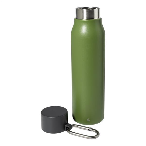 Dwuścienna, izolowana butelka próżniowa ze stali nierdzewnej z pokrywką z PP i karabińczykiem z recyklingowanego aluminium. Pojemność 500 ml.