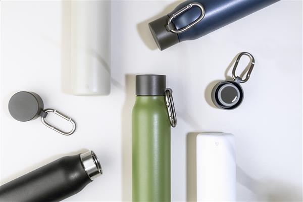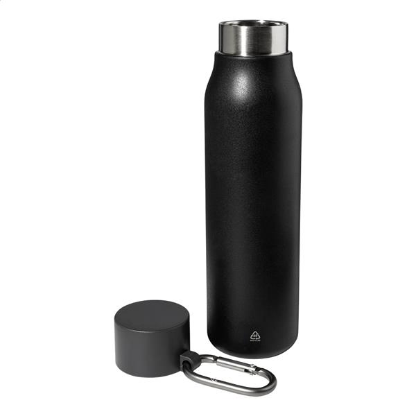Dwuścienna, izolowana butelka próżniowa ze stali nierdzewnej z pokrywką z PP i karabińczykiem z recyklingowanego aluminium. Pojemność 500 ml.