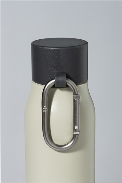 Dwuścienna, izolowana butelka próżniowa ze stali nierdzewnej z pokrywką z PP i karabińczykiem z recyklingowanego aluminium. Pojemność 500 ml.