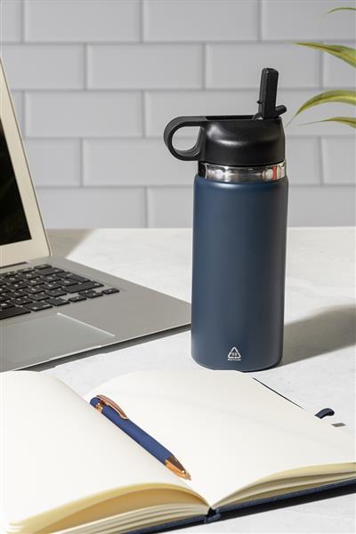 Butelka próżniowa z podwójną ścianką, wykonana z recyklingowanej stali nierdzewnej, z pokrywką z polipropylenu z zatrzaskiem, uchwytem do przenoszenia i zintegrowaną słomką. 500 ml.