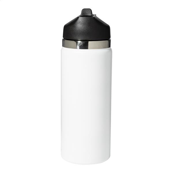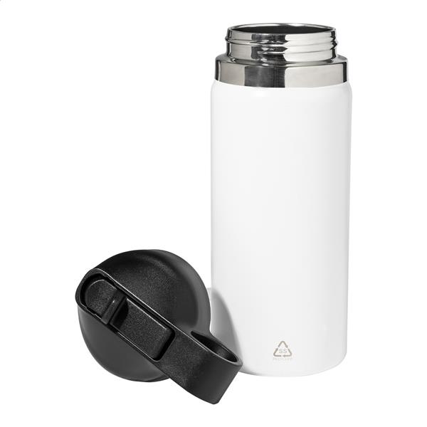Butelka próżniowa z podwójną ścianką, wykonana z recyklingowanej stali nierdzewnej, z pokrywką z polipropylenu z zatrzaskiem, uchwytem do przenoszenia i zintegrowaną słomką. 500 ml.