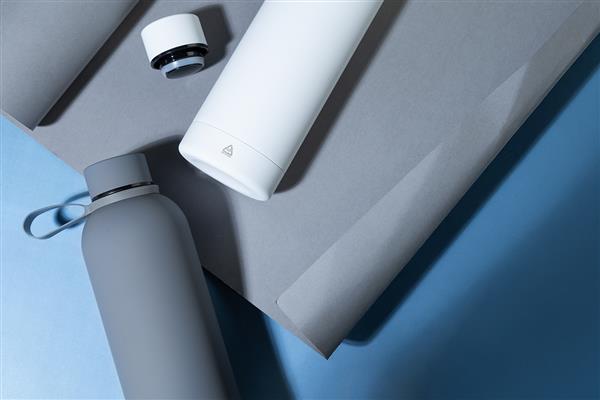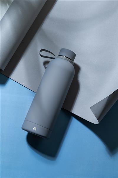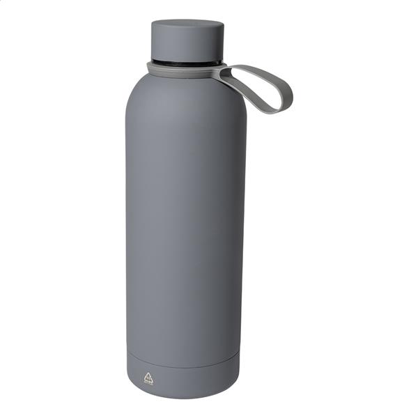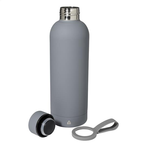 Butelka izolowana próżniowo, z podwójnymi ściankami, wykonana ze stali nierdzewnej z recyklingu, z gumowanym wykończeniem i silikonowym uchwytem do przenoszenia, 500 ml.