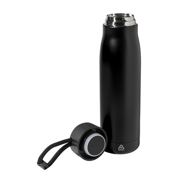Butelka z podwójną ścianką, izolowana próżniowo, wykonana z recyklingowanej stali nierdzewnej, z pokrywką PP i zintegrowanym paskiem do noszenia. 500 ml.