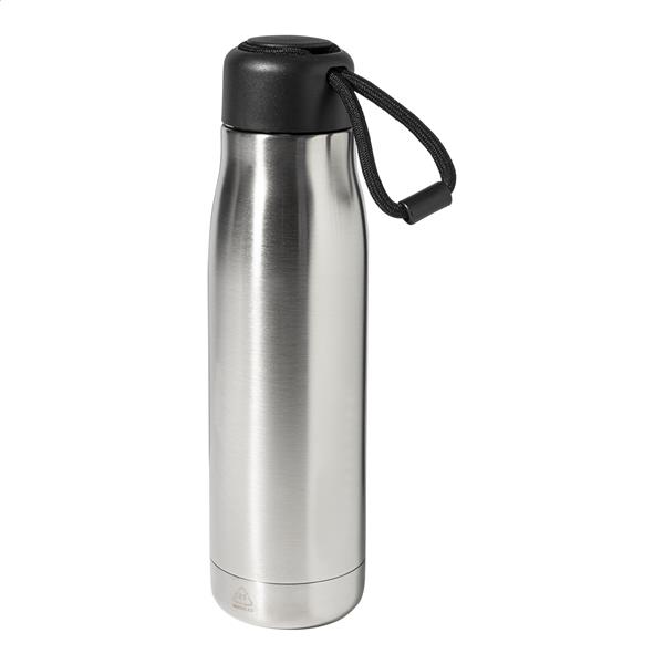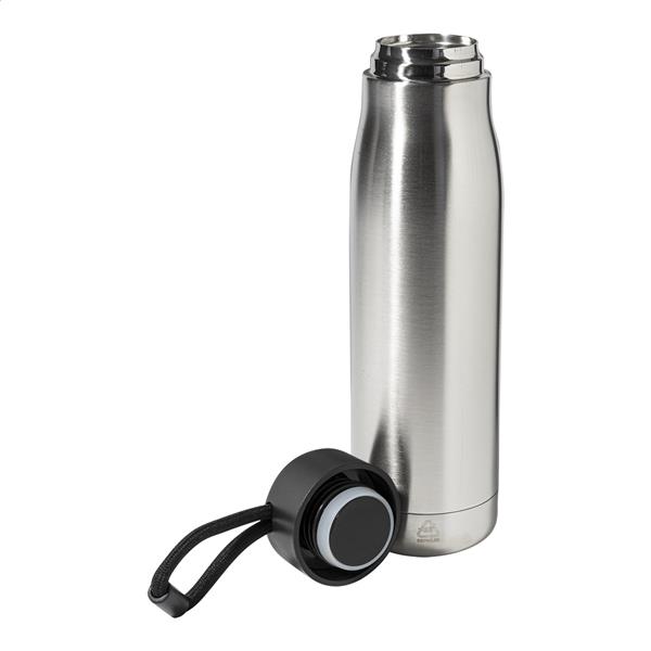 Butelka z podwójną ścianką, izolowana próżniowo, wykonana z recyklingowanej stali nierdzewnej, z pokrywką PP i zintegrowanym paskiem do noszenia. 500 ml.