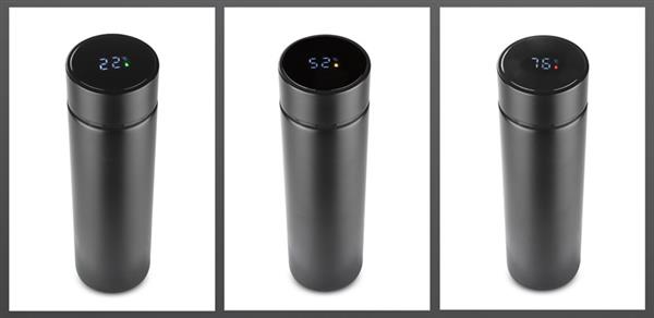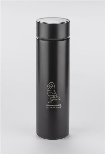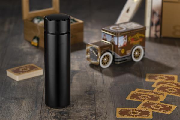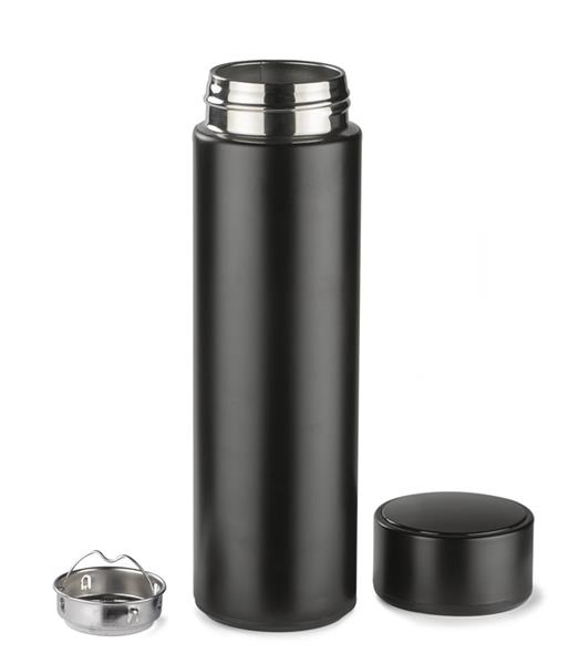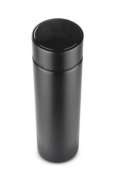 Butelka termiczna THERMO to bardzo interesujący gadżet. Łączy w sobie klasyczną funkcję termosu i elektronikę w postaci wbudowanego w nakrętkę dotykowego termometru cyfrowego. Wystarczy obrócić butelkę do góry dnem na 10 sek., aby odczytać najbardziej dokładną temperaturę napoju. Dodatkowo wyświetlana jest ikona kropelki, która zmienia kolor w zależności od temperatury: czerwona, gdy napój jest gorący, żółta, gdy nadaje się do picia, a zielona kiedy jest zimny. Dzięki próżni między ściankami trzyma temperaturę ok. 13 godzin. Wykonana ze stali nierdzewnej 304. Wewnątrz znajduje się sitko, dzięki któremu możemy zaparzyć herbatę.