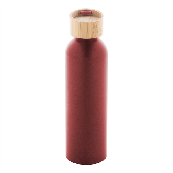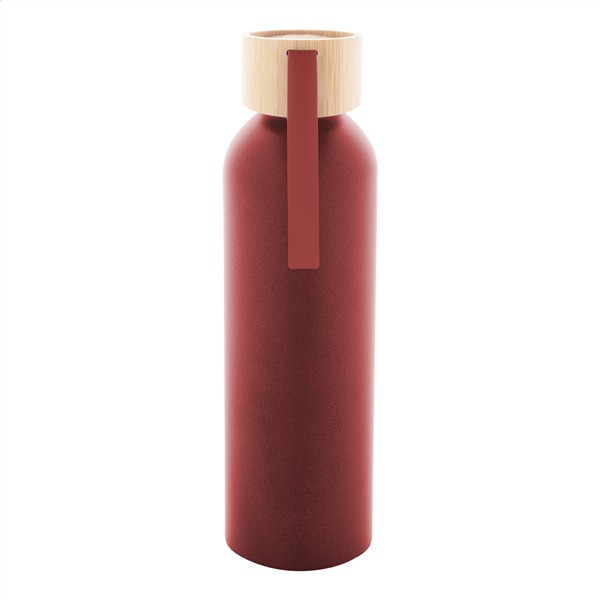 Butelka aluminiowa z recyklingu z bambusową pokrywką i silikonowym paskiem do noszenia w pasującym kolorze, 600 ml.