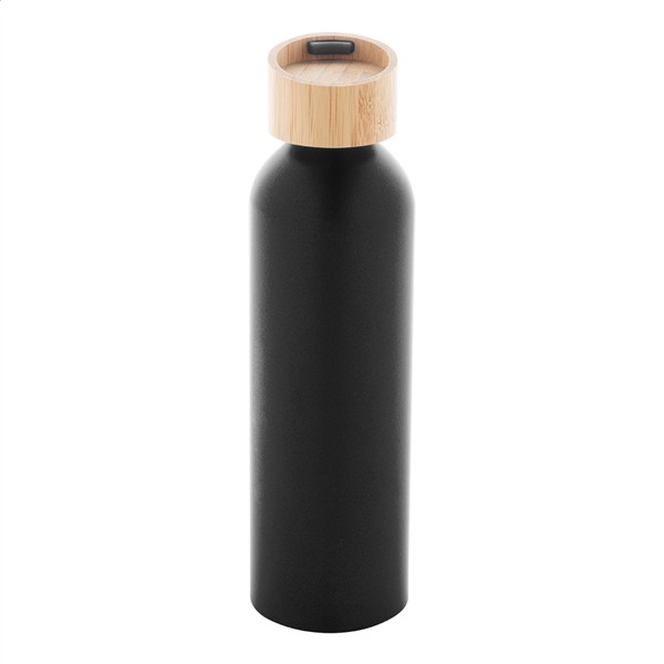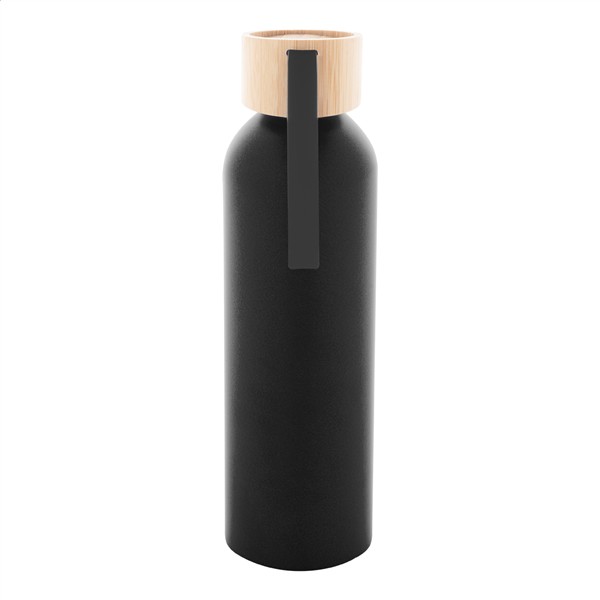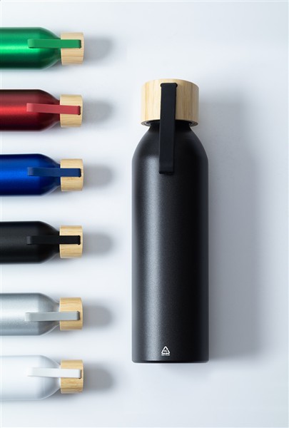 Butelka aluminiowa z recyklingu z bambusową pokrywką i silikonowym paskiem do noszenia w pasującym kolorze, 600 ml.