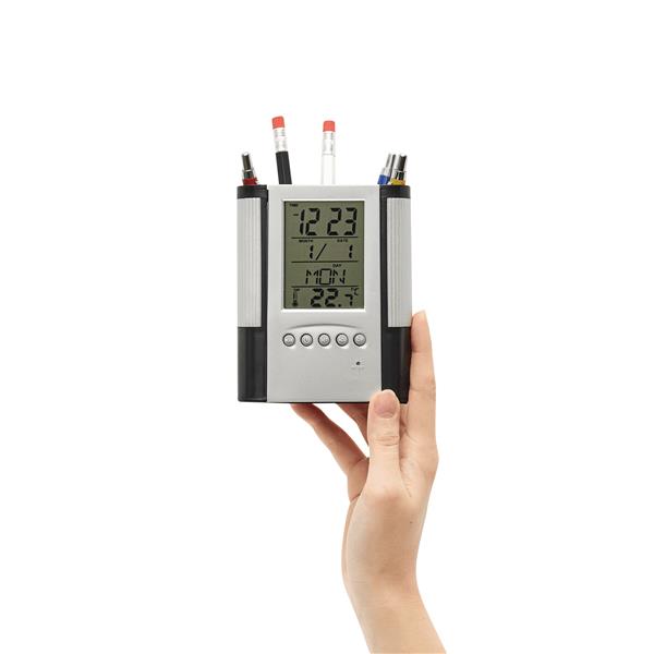 Zegar BUTLER z wyświetlaczem LCD, datownikiem, termometrem i przezroczystym stojakiem na przybory biurowe.