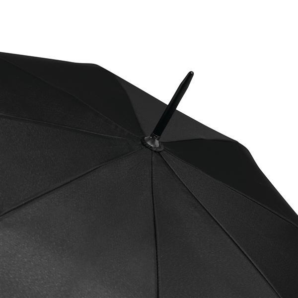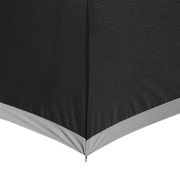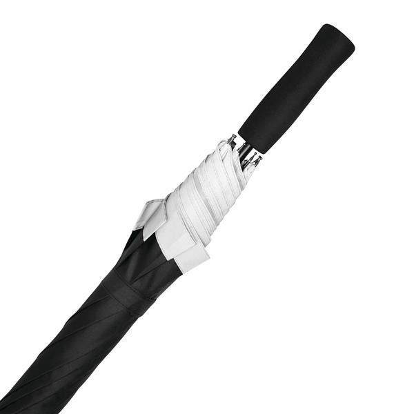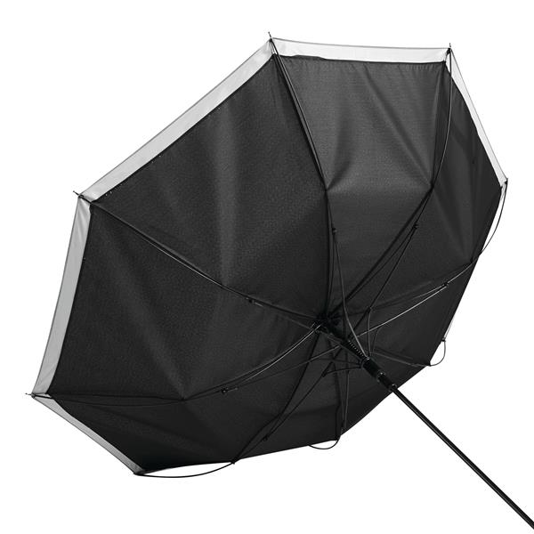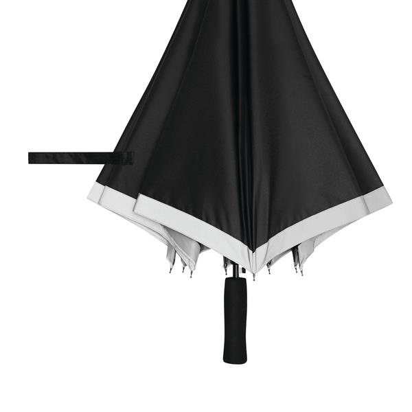 Automatyczny parasol CALIMA. Posiada metalową laskę, szyny z włókna szklanego, metalowe końcówki oraz uchwyt EVA. Czasza wykonana jest z poliestru pongee z tworzywa sztucznego pochodzącego z recyklingu / RPET i posiada srebrny pasek odbijający światło. Zapinany jest na rzep.