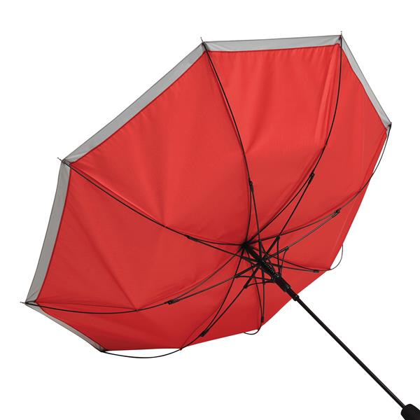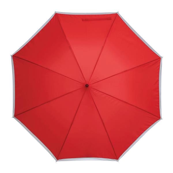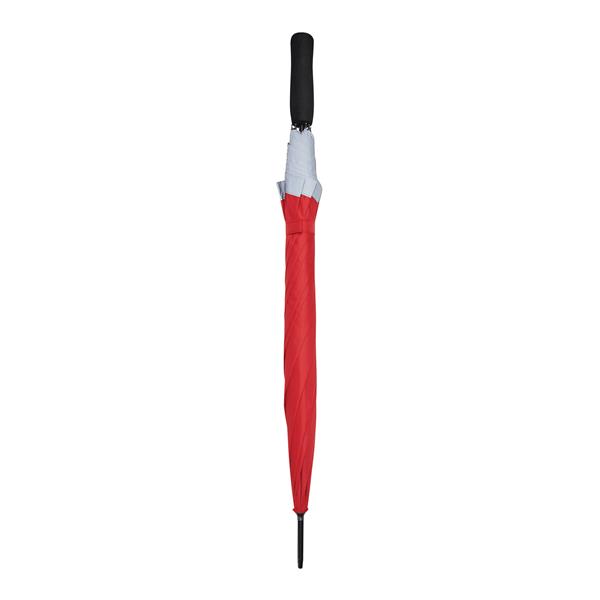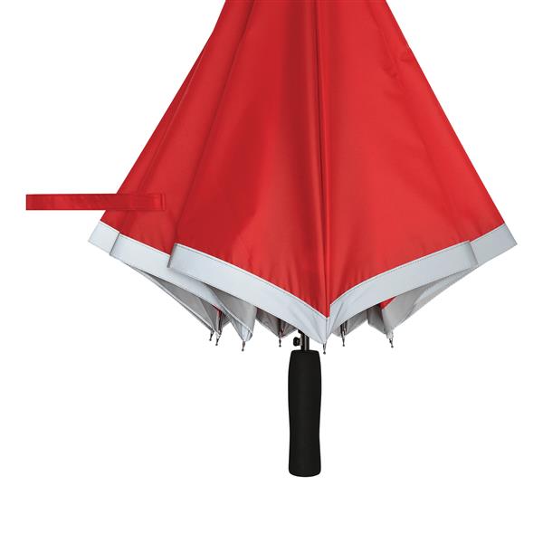 Automatyczny parasol CALIMA. Posiada metalową laskę, szyny z włókna szklanego, metalowe końcówki oraz uchwyt EVA. Czasza wykonana jest z poliestru pongee z tworzywa sztucznego pochodzącego z recyklingu / RPET i posiada srebrny pasek odbijający światło. Zapinany jest na rzep.