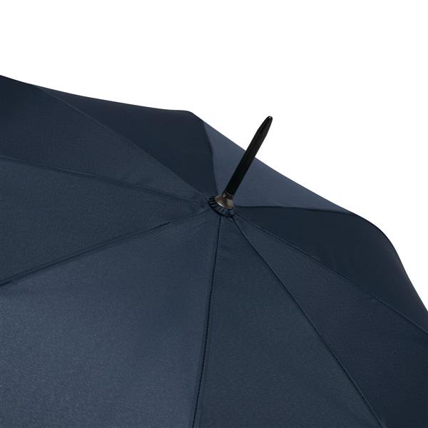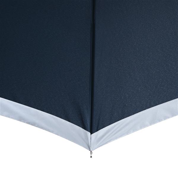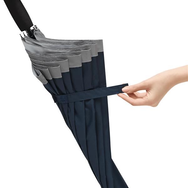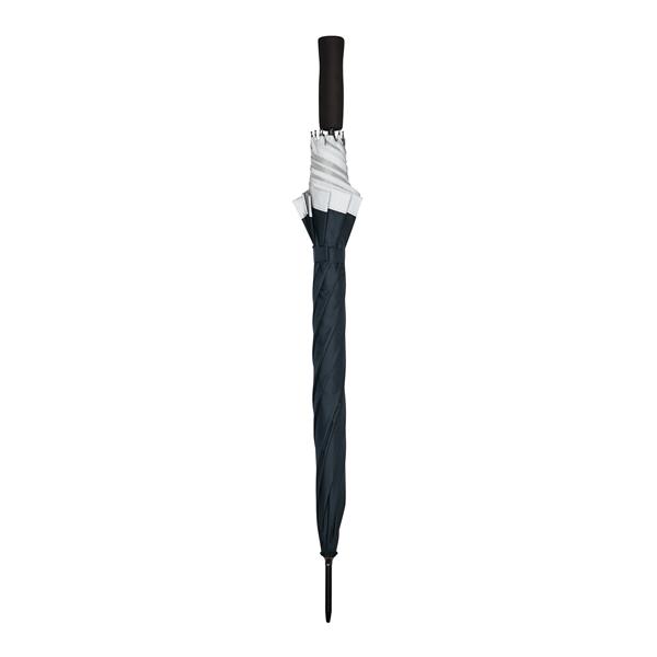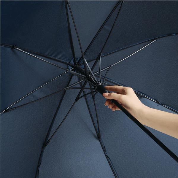 Automatyczny parasol CALIMA. Posiada metalową laskę, szyny z włókna szklanego, metalowe końcówki oraz uchwyt EVA. Czasza wykonana jest z poliestru pongee z tworzywa sztucznego pochodzącego z recyklingu / RPET i posiada srebrny pasek odbijający światło. Zapinany jest na rzep.
