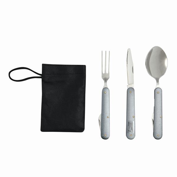 Trzyczęściowy zestaw sztućców na biwak CAMPING zawiera składane sztućce, w tym nóż, widelec i łyżkę z otwieraczem do butelek. W nylonowej sakiewce z rzepem i uchwytem. Tagi: Na zewnątrz,przedmioty rekreacyjne,namioty,sztućce,noże/zestawy Kolor: szary Materiał: Stal nierdzewna/Nylon