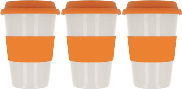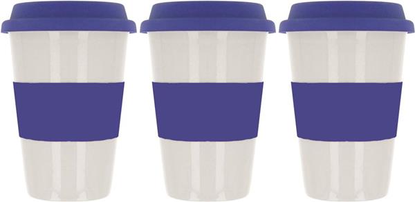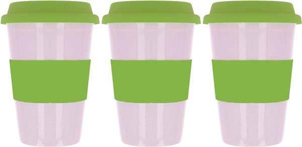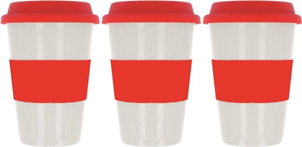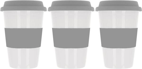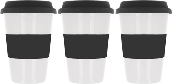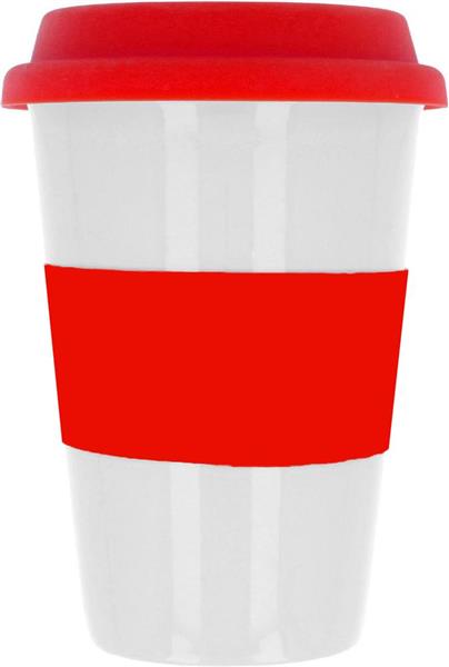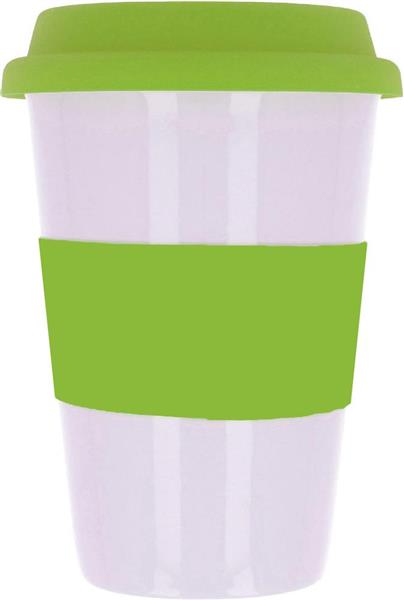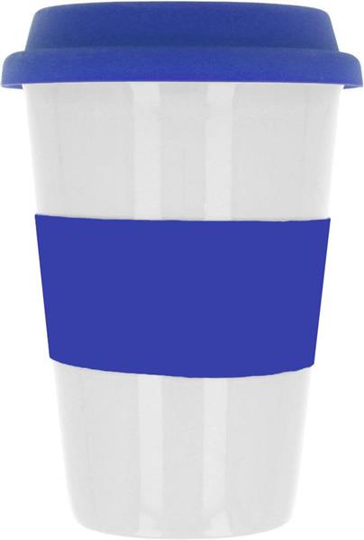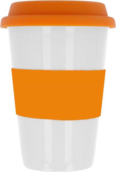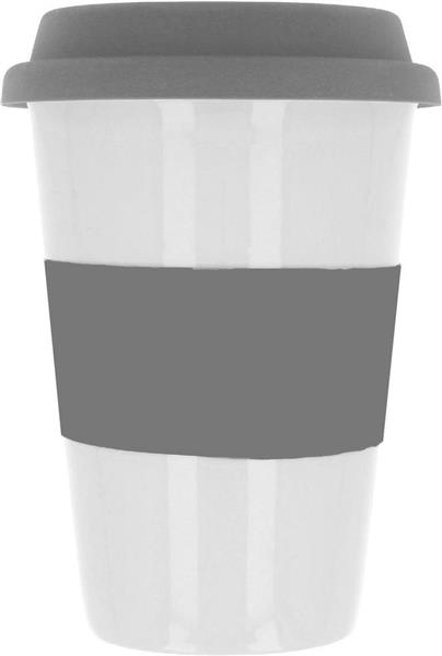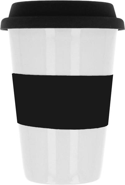 Pojedynczy ceramiczny kubek z silikonową nakładką i panelem do chwytania. Pojemność 400ml. Transfer ceramiczny jest odporny na zmywanie w zmywarkach. Jako że jest to jednowarstwowy kubek, nagrzewa się też zewnętrzna strona.