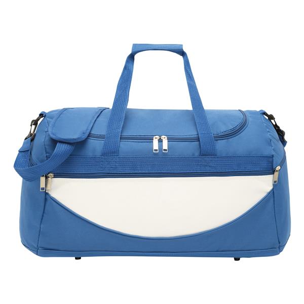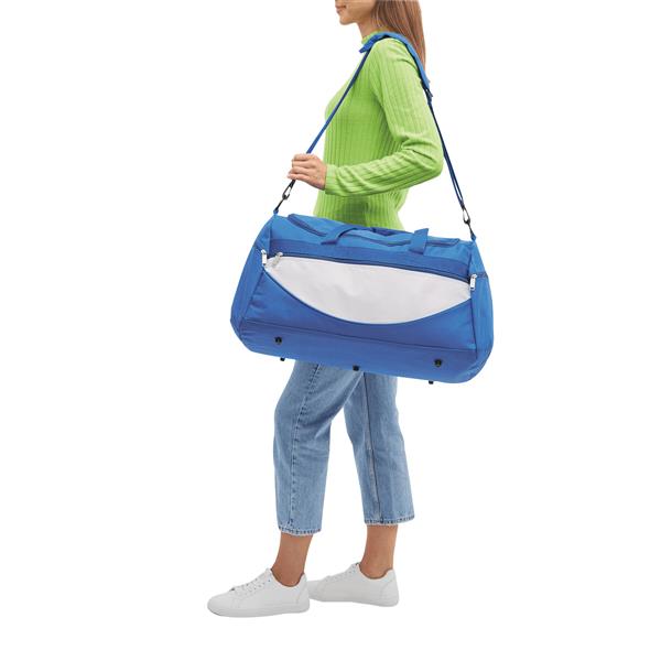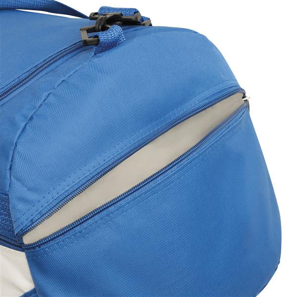 Torba na ramię CHAMP zamykana na zamek błyskawiczny z dużą kieszenią, kieszeniami bocznymi, mocnym uchwytem do noszenia odpinanym paskiem na ramię z miękką podkładką, którego długość można regulować. Materiał: 600D Poliester Kolor: biały, niebieski Tagi: Torby sportowe,torby,bagaż,artykuły sportowe,fitness